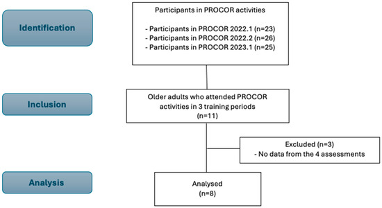 Eleven older adults attended all three training periods of PROCOR activities and were initially identified and included. Three participants did not perform the four assessments required to evaluate the two detraining periods and were excluded from the sample (Figure 2). Thus, eight older adults participated in the study, 50% female and 50% male. In general, the participants were overweight, and the most prevalent cardiometabolic risk factors were hypertension and dyslipidemia (Table 1).