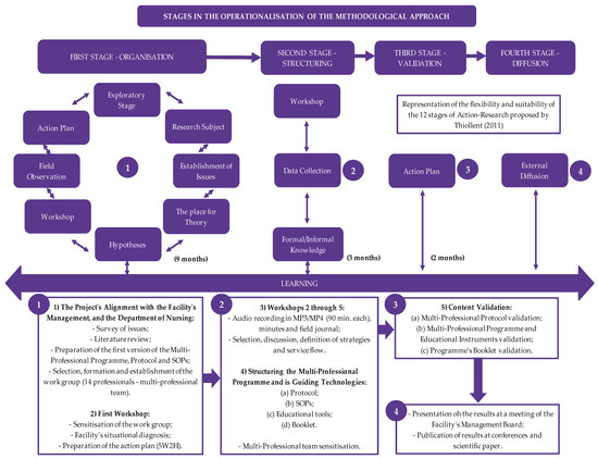This is participative research of the action-research category with a qualitative–quantitative approach performed based on the 12 stages proposed by Thiollent [20] and adapted to four interdependent stages: Stage One–Organisation; Stage Two–Structuring; Stage Three–Validation; and Stage Four–Diffusion (Figure 1).