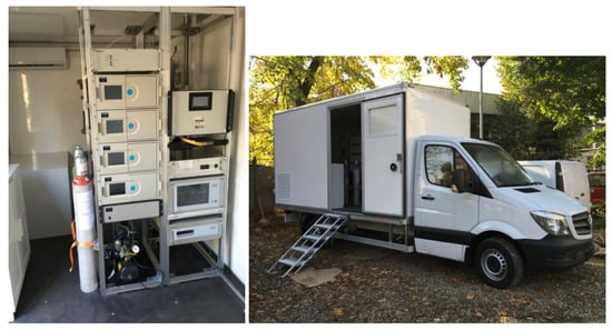 Our research employed an innovative mobile laboratory specifically engineered for pollution monitoring. Outdoor VOC levels are generally quantified by concentrating the chemicals on adsorbent materials, followed by thermal desorption and then measurement using gas chromatography (GC). This method is commonly employed for continuous outdoor pollution monitoring; however, the primary drawback is the high cost of the equipment. Figure 1 displays photos of the mobile laboratory utilized for these measurements. The laboratory is equipped to monitor BTEX compounds (benzene, toluene, ethylbenzene, and o-, m-, p-xylene), typically emitted by gasoline and diesel engines, alongside inorganic pollutants (SO2, CO, NOx, ozone), particulate matter (PM2.5 and PM10), and meteorological parameters (wind speed and direction, temperature, humidity, pressure, precipitation, and solar radiation), irrespective of external weather conditions.