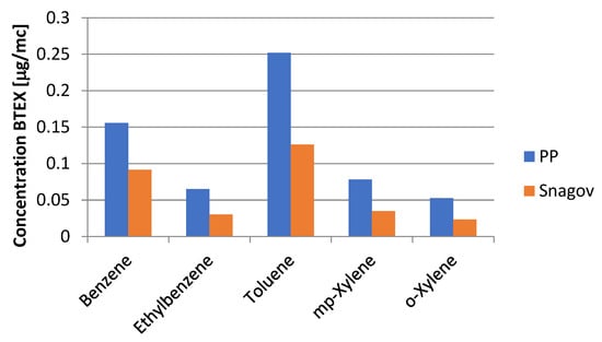 Brocco et al. [38] found that traffic is the main source of pollution when the T/B ratio is greater than 1. Hsieh [39] et al. looked at how pollution sources at different distances affected the m,p X/E ratio and found that when the distance is very short, it goes above 3.3, which does not happen in our data. Khoder’s study [30], which compared BTEX ratios in different places around the world, showed that these ratios can help figure out whether pollution comes from factories or cars. The BTEX rates for PP and Snagov (Table 3) give us important information about the places where pollution comes from. In PP, the B/T ratio is 0.62, which is less than 1, which means that pollution comes from a number of different sources. However, traffic is expected to play a big role, as shown by the high T/E ratio (3.86). This backs up the conclusion that traffic is the main source when T/B is greater than 1. The B:T:E:X ratio at PP is 2.3:3.8:1:2. This is very similar to the traffic-related ratio of 3:4:1:5 that Khoder [30] found, which supports the idea that car emissions are a major cause at this site. The B/T ratio in Snagov is a little higher at 0.73, which shows that the pollution profile is different from that in PP. The low T/E ratio of 0.24 shows that traffic is not the main cause of pollution here, since the levels of toluene are much lower than those of ethylbenzene. This is also shown by the B:T:E:X ratio of 3:0.24:1:1.9, with toluene being much less common. This could be because there are fewer emissions from traffic and more from natural or regional sources. Overall, these numbers show how much pollution is caused by traffic in PP compared to Snagov, which is cleaner and less affected by traffic.