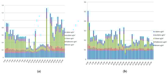 BTEX compounds during a sunny (a) and rainy day (b), measured in PP.