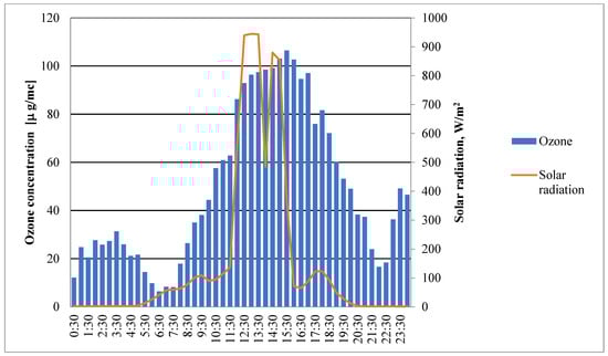 The data from the PP site on a sunny summer day (25 August 2021) illustrate the strong influence of solar radiation on ozone formation, as shown in Figure 6.