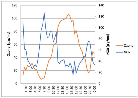 The inverse link between NOx (nitrogen oxides) and ozone concentrations seen during the day, as shown in Figure 7, shows how photochemical processes work in city air. NOx levels are high at night and early in the morning because of constant emissions from cars and factories. On the other hand, ozone levels are low because photochemical ozone production is stopped by the lack of sunshine.