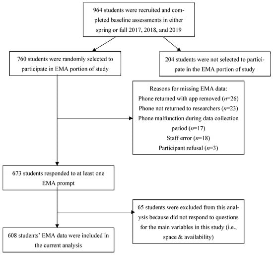 The current analyses used data collected from students aged 9–15 years who participated in the Wellness Champions for Change (WCC) study [30]. WCC was a school-based cluster randomized controlled trial examining strategies for enhancing the implementation of local wellness policies in schools by training teachers and students as champions who lead wellness teams [30]. EMA measures were employed to test a secondary hypothesis that health-promoting environments would moderate the impact of a school-based intervention. Participants were from 33 elementary and middle schools from five geographically-diverse school districts in a Mid-Atlantic state. A total of 964 students were recruited and completed baseline assessments (i.e., completed surveys, wore an accelerometer, and completed EMA prompts using a mobile phone) in either the spring or fall of 2017, 2018, and 2019 through in-person recruitment in classrooms, during lunch, and at after-school events for families or through school announcements, posters, flyers, and informational pamphlets. Interested students provided parental contact information then the study was discussed with the parents/guardians. Written informed consent and assent was provided by the parent/guardians and students, respectively. Following the baseline evaluation, schools underwent randomization. By design, a subset of students (n = 760, 78.8%) was randomly selected from the original sample to participate in the EMA portion of baseline data collection. Approval was granted by the institutional review board of the university (ethics approval number: HP-00067626) and five participating school districts. Participants were provided a $15 gift card for completing the baseline survey and another $15 gift card for wearing the accelerometer. There were no incentives for completing the EMA portion of the study.