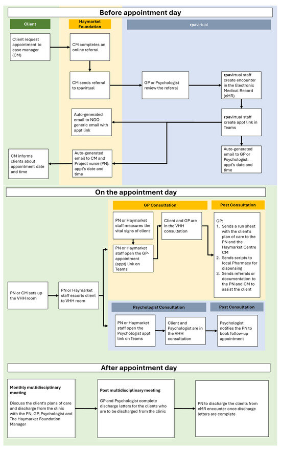 - Rpavirtual, Virtual Healthcare Hubs for People Experiencing Homelessness: Virtual Care Centre Model of Care; Sydney Local Health District: Sydney, Australia, 2023.