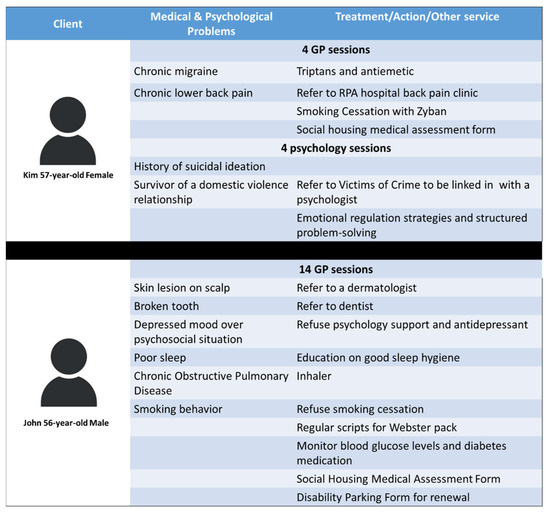 The full adoption of the VHH by clients at the Haymarket Centre can be seen from the wide range of services delivered. Two VHH case studies are presented in Figure 3 to provide a summary of the nature and frequency of the treatment given to the clients. Both clients had more than one GP session, and one client booked both GP and psychologist sessions. Health problems included self-care issues such as poor sleep, physical concerns such as chronic lower back pain, migraine, broken tooth, skin lesions, pulmonary disease, psychological conditions associated with being a survivor of domestic violence and having a depressed mood disorder, and lifestyle problems such as smoking. The services provided included medical prescriptions, psychological therapy such as emotional regulation and problem-solving strategies, referral to dentist and specialists, assistance to fill out social housing medical and disability parking forms, and healthy lifestyle education such as advice on sleep hygiene practice and smoking cessation.