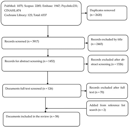 A total of 3917 titles were screened, followed by 1452 abstracts. In total, 126 full-text articles were screened, removing 70 articles. Additionally, we searched the reference list of relevant articles and identified two articles, resulting in a total of 58 documents included in this review (Figure 1).