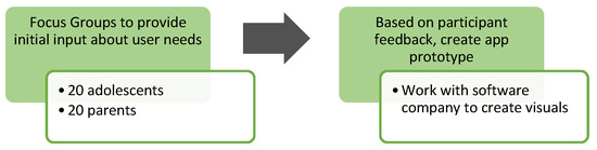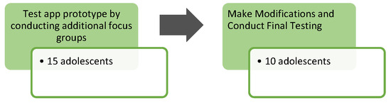 We used a multi-phased iterative user-centered design approach to obtain an understanding of the needs and preferences of the intervention’s end users (i.e., the adolescents). While there are multiple ways to carry out user-centered design [38], our process is informed by the literature, including an initial focus group, testing of the initial app prototype, modifications to the app prototype, and final testing [39] (see Figure 1). This information was then used to iteratively develop intervention content and measure usability. Throughout the development process, the research team created visual mockups, known as paper prototypes (from here forward app prototypes).