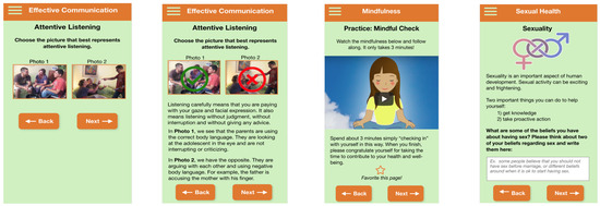 After the creation of the initial set of prototypes, two waves of focus groups were conducted to obtain feedback from adolescents. During the first wave, three focus groups (n = 15) were conducted. The full intervention modules were presented to obtain feedback on the developed prototypes and participants were asked to provide feedback on each presented “screen” and asked to “think aloud” as they made their selections. The “think aloud” method is used to understand participants’ navigation of websites, identify problems early in the design process, and develop suggestions for improvement [35]. A traditional think aloud protocol, or one in which minimal prompting is provided (i.e., no probes beyond “keep talking”) was used so as not to bias participant feedback [35]. Due to the COVID-19 pandemic, protocol modifications had to be made to conduct the focus groups online. Recommended changes were incorporated into the modules before the second wave of focus groups. For the second wave, three (n = 11) focus groups were conducted. During these focus groups, participants were asked specific questions about the look and feel of the prototypes, the placement of buttons, the ordering of content, and the actual content (Figure 4). The provided adolescent feedback was used to make further modifications to the prototypes. Adolescents expressed positive feedback overall.