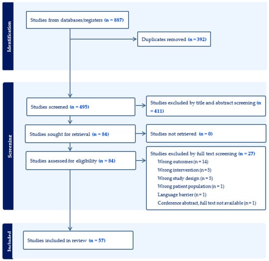 The search yielded a total of 887 articles. After duplicates had been identified and removed, 495 unique articles were included (Figure 1). Title and abstract screening resulted in the exclusion of 411 articles, and the remaining 84 articles were assessed for eligibility based upon the objectives of this scoping review. After that, 27 articles were further excluded by full-text screening, resulting in a final total of 57 articles (Figure 1). The reasons for the full-text exclusion phase were mainly due to wrong outcomes (i.e., the study did not evaluate barriers nor facilitators), or wrong interventions (i.e., the study did not primarily address the lift machine), or the wrong study design (i.e., the study design did not adequately match the research question). All included studies were of medium to high quality (File S3).