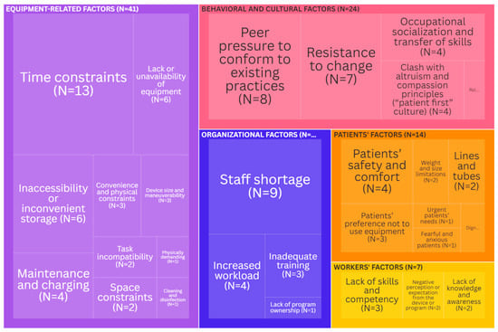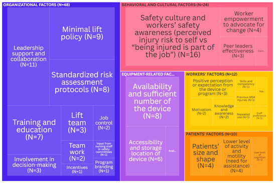 Facilitators: Organizational factors were the most cited (48 times) facilitators for the use of the assistive device (Figure 3). The presence of strong leadership support and collaboration emerged as the top influencing factor [21,24,25,30,38,46,47,48,49,50,51]. It was followed by the presence of a minimal lift policy (legislation) [7,31,44,52,53,54,55,56,57], and of standardized risk assessment protocols and standards [7,20,33,35,46,50,52,58]. The training and education of healthcare workers [38,39,43,47,52,56,59] were also important determinants of lift use. Behavioral and cultural factors emerged as important facilitators (cited 24 times) for lifts use. Safety culture (climate) and workers’ safety awareness, including the perceived risk of self-injury, versus the acceptance of injury as “part of the job” [6,21,24,30,36,41,43,48,53,60,61,62,63,64,65,66] were the most mentioned. Worker empowerment [6,26,38,43] was revealed to be an important determinant as well. Equipment-related factors were less commonly referred to as facilitators (cited 16 times): these included the availability and sufficient number of devices [10,25,28,43,50,52,63,64], the accessibility and storage location of devices [10,25,28,52,64,67], and the availability of equipment supplies [10,47]. Patients’ and workers’ factors were the least mentioned. The two most common facilitators due to patients’ factors were patients’ size and shape [10,28,42,61] and a lower level of activity and motility (assistance need) [10,28,42,61]. The most common worker-related facilitator was a positive perception or expectation of the device or program [65,68,69].