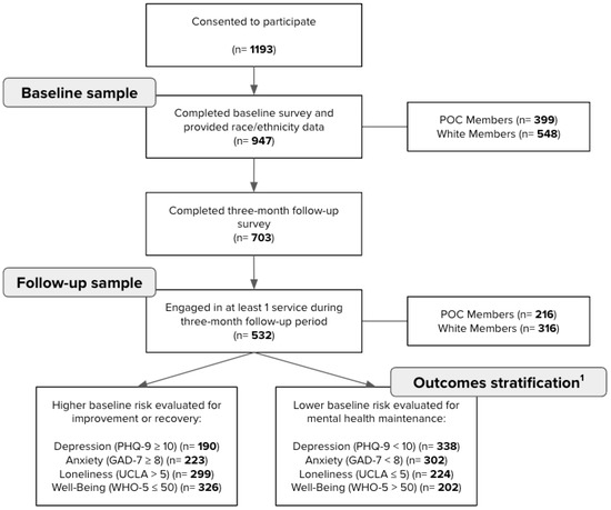 To evaluate our third aim exploring race/ethnicity differences in outcomes, we tracked changes in clinical symptoms and psychosocial outcomes relative to participants’ baseline symptoms. For participants with scores meeting the clinical cut-off for that measure at baseline (“higher risk”), we used logistic regression models with a binary race/ethnicity indicator (POC vs. White) as the predictor to evaluate the likelihood of improvement or recovery in that measure at follow-up. Specifically for depressive and anxiety symptoms, we looked at improvement or recovery; for loneliness, we looked at recovery; and for well-being, we looked at improvement. We also used chi-squared tests to compare differences in improvement/recovery rates. We present unadjusted models in the Section 3 Results and include models that adjust for age, gender identity, and level of education in the Supplementary Materials. We also present linear regressions using follow-up scores as the outcome, race/ethnicity as the predictor, and baseline scores as a covariate in the Supplementary Materials.
