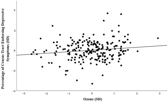To estimate associations between depressive symptoms and ozone concentrations, a linear regression model was conducted. As shown in Table 3, the association between ozone and depressive symptoms was significant, above and beyond contributions of relevant covariates (b = 0.19, SE = 0.37, t = 2.14, p = 0.034; see Figure 1), such that census tracts with higher ozone had larger percentages of students who reported depressive symptoms. In addition, higher percentages of students identifying as nonbinary for gender identity, American Indian or Alaskan Native, Hispanic, or Multiracial, who had asthma, were low income, or had an older average age were significantly associated with larger percentages of students endorsing depressive symptoms, while census tracts with more students identifying as Native Hawaiian or Pacific Islander had a smaller percentage of students who reported symptoms (See Table 3).