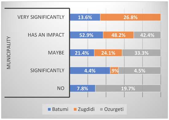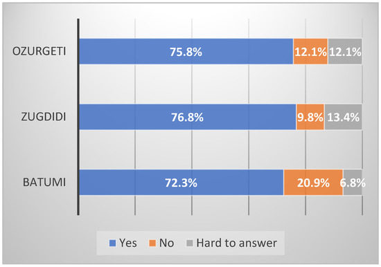 The sample size for the selected citizens’ interviewing population was calculated using Cochran’s sample size formula: n = z2 × P × (1 − p)/E2. where 95% of confidence level z = 1.96; the margin of error is 5% (E = 0.05), and the assumed response distribution is 50% (P = 0.5); n = (1.96)2 × 0.5 × 0.5/(0.05)2 = 3.8416 × 0.25/0.0025 = 384.16. We found that for the street survey, the sample size was approximately 384. For sufficient results, we calculated the population of each selected municipality using Geostat data for the year 2023 [36], and the sample size for each municipality was calculated in proportion to its population compared to the municipality’s total population. The final sample size per municipality by interviewing the population was Batumi—206, Ozurgeti—66, and Zugdidi—112.