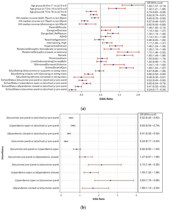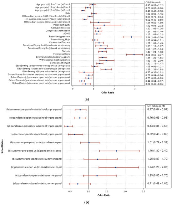 Figure 1b provides additional adjusted odds ratios of victims of bullying (using the same covariates as Figure 1) for pairwise levels of the school/pandemic status. Of note is that cases assessed during the pandemic when schools were open to in-class learning compared to pre-pandemic periods were less likely to have been a victim of bullying (aOR 0.63, CI 0.54–0.74), and more likely for those during the pandemic when schools were open to in-class learning compared to not open to in-class learning (aOR 1.55, CI 1.22–1.98).