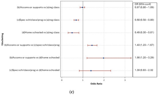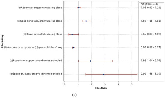 Figure 2c reports pairwise ORs for educational classroom or setting for bullying peers. Those attending special schools, classes, or programs were more likely, after adjustment, to have bullied their peers than in the other three types of settings: regular classrooms with or without supports, or home-schooled.