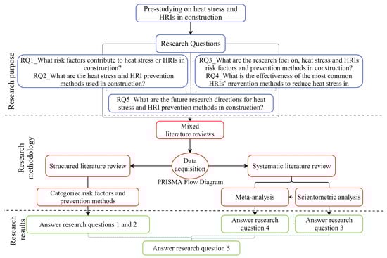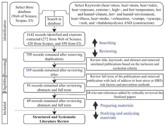 This study applies the mixed literature review methodology, involving a structured and systematic literature review to develop a comprehensive analysis of heat stress and HRIs, their risk factors, research focuses, control methods, and their effectiveness in construction. First, a structured literature review of heat stress (or HRI) risk factors is conducted, in which the risk factors are categorized into eight different groups. Heat stress (or HRI) control methods are reviewed and classified into three categories. Second, a systematic literature review uses a scientometric analysis of selected studies to elaborate on research focuses, most frequently cited risks, and preventive measures. Furthermore, a meta-analysis evaluates the effectiveness of the most recognized critical control methods. Figure 1 illustrates this study’s research process to clarify the steps and procedures.