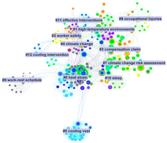 To identify the research focus and scientific references on risk factors and prevention methods, a scientometric analysis was conducted using the CiteSpace software. CiteSpace was selected for its robust capabilities in visualizing trends, mapping co-citation networks, and identifying key research themes in large datasets, making it particularly suited for this study. A network system visualizes the issue’s main topics as the nodes and their index references as the connections. The visualization results in Figure 4 illustrate that heat strain, high-temperature environments, and worker safety are the most cited critical terms. In addition, cooling vests, work–rest schedules, and cooling interventions were identified as the most significant research focus on prevention strategies. In addition, high-temperature environment was recognized as the most frequent term in heat stress risk factors.