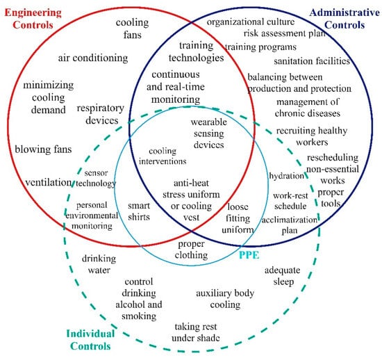 To effectively manage heat stress, employing a range of control strategies that address external environmental factors and individual behaviors is crucial. This study provides a comprehensive overview, as illustrated in the Venn diagram, which categorizes heat stress control strategies into engineering controls, administrative controls, PPE, and an additional layer of individual controls. Figure 6 illustrates this diagram, representing the control methods and highlighting their overlaps and distinctions. While engineering methods, administrative controls, and PPE are the traditional levels of control, this study introduces an additional barrier for managing heat stress: individual controls. Heat stress and HRI control methods that workers should perform are defined as individual control methods, including proper hydration by drinking water regularly and in a specific amount [24], acclimatization by taking a proper work–rest schedule, resting under a tent or shaded or cooled area [19,34,42,71], wearing proper clothing with a single layer and light color, wearing anti-heat-stress clothing and UV protection, using appropriate PPE to decrease the physical intensity of the work and metabolic heat [28], monitoring risk factors by wearing wearable sensing devices [39], having auxiliary body cooling, self-monitoring by using physiological responses, getting adequate sleep, and controlling destructive habits like drinking alcohol and smoking [8,14,72].