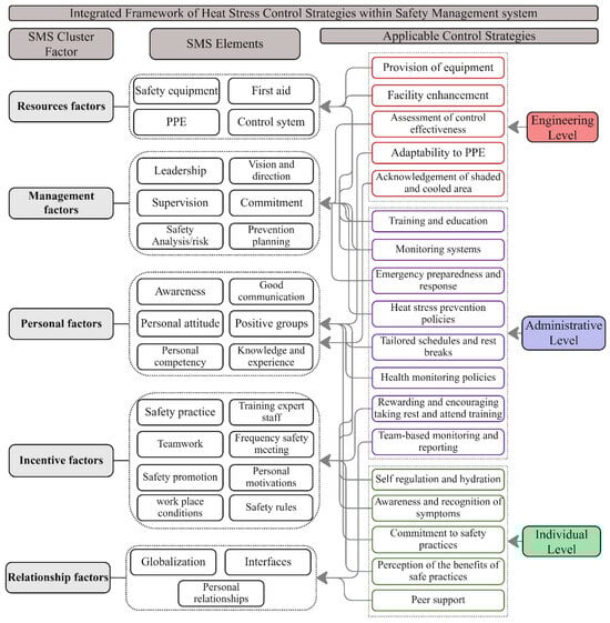Having a framework for heat stress control is crucial for systematically managing the risks associated with extreme temperatures and ensuring employee well-being. A safety management system (SMS) is a foundational resource valued for its structured approach that includes policy development, risk assessment, control measures implementation, training, effective communication, ongoing monitoring, thorough incident investigation, emergency preparedness, meticulous documentation, and continual improvement, supported by essential factors such as safety equipment, leadership, communication effectiveness, personal competency, and workplace conditions [84]. This study developed a comprehensive heat stress control framework using SMS components. Figure 7 shows this framework, the clusters of SMS safety factors, their elements and relations, the integration of the control levels in the system, and their resource allocations to prevent heat stress in construction.