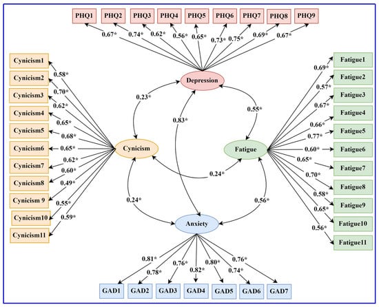 The structural equation model showing the latent variables and their indicators (measurement model) and the relationship between cynicism, depression, anxiety, and fatigue is shown in Figure 1.