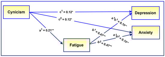 The literature also reported a link between cynicism and emotional exhaustion [43,44,45] as well as between emotional exhaustion and physical and emotional fatigue [46]. We speculated that fatigue might be the mechanism through which cynicism affects mental health. We, thus, also examined the following hypothesis: