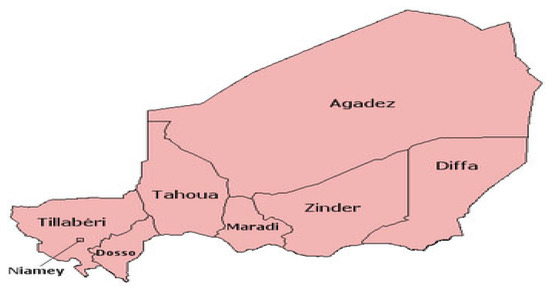 Map of Niger showing the different regions. Source: https://en.wikipedia.org/wiki/Regions_of_Niger (accessed on 20 October 2024).