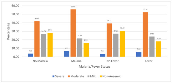 Anaemia and fever are health problems of significant public health concern, particularly among under-5 children in developing countries [1]. Children under the age of five are said to be anaemic when they have a low concentration of blood haemoglobin below 11 g/dL [2,3]. Moreover, fever in children is diagnosed at the body temperature of 38.5 °C or more (101.3 °F) for children older than three months and 38.0 °C (100.4 °F) or more for those who are three months or less [4]. Some statistics have shown that around 43% of under-5 children are anaemic globally, while fever is the leading cause of hospital admissions among these children [5,6]. In sub-Saharan Africa (SSA), 28.5% of under-5 children are anaemic [7,8]. The adverse health consequences of anaemia in children include stunting, the impairment of cognitive development, immune system compromise, and a high risk of morbidity and mortality [9].