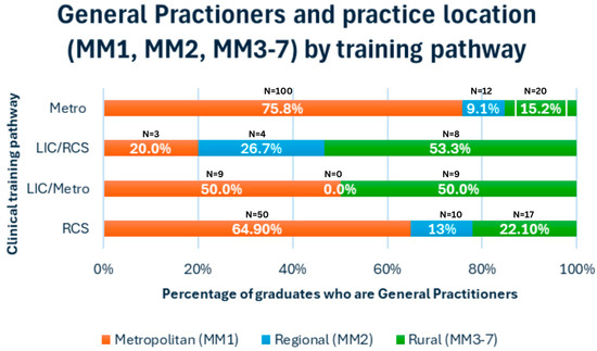 No statistical significance was found between graduates’ training pathways and their registered medical specialty (Table 1). A comparison of the graduates found that at this time point (2023), all training pathways produced more GPs than other medical specialties. Briefly, GPs represented the following percentages of those with a registered vocational qualification for each training pathway: 75% for LIC/RCS, 72% for LIC/metro, 65.3% for RCS, and 57.9% for metro only (Table 1).