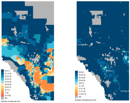 Number of active wells and facilities per square kilometer during the years 2016–2021 in Alberta, Canada. NA = No data reported or no wells present.