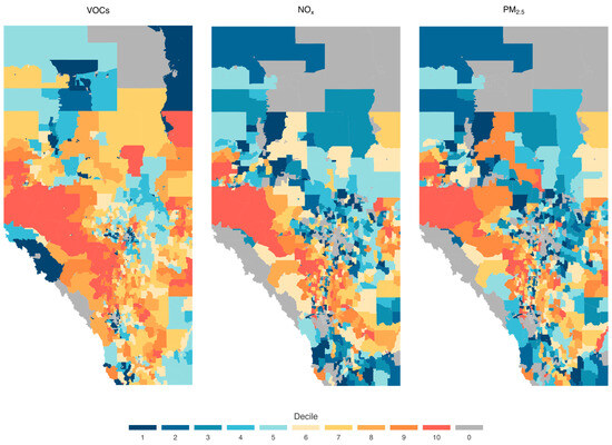 Estimated PM2.5 density per DA, NOx density per DA, and VOCs density per DA for Alberta, Canada, during the years 2016–2021. The emission units for the three pollutants are initially kg per km2 per year. Then, the DAs with emissions estimates are divided in 10 equal parts (deciles). Thus, each decile has the same number of DAs. DAs with zero (gray) indicates that no emissions were reported.