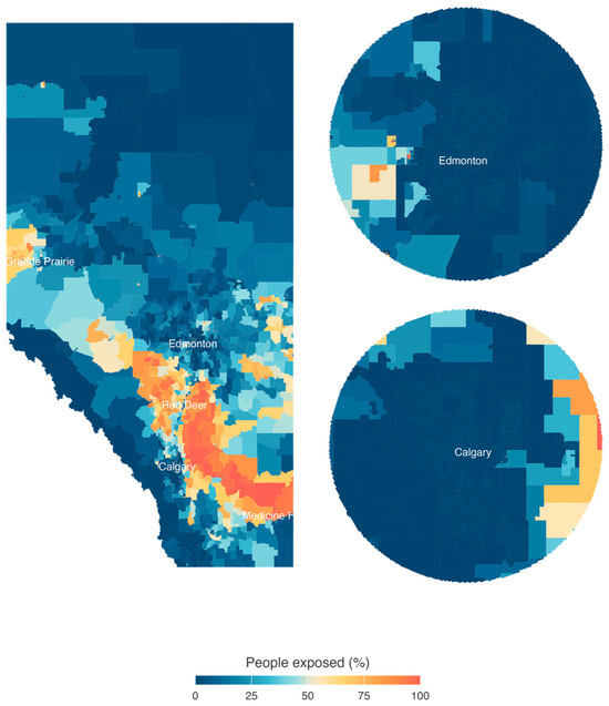 According to the 2016 Census, Alberta was home to 4,067,040 people and had 5803 DAs (mean = 110.28 km2; median = 0.28 km2). Population density varied significantly (0–73,167 people per km2; mean = 2514 people per km2; median = 2221 people per km2), with the larger urban centres (e.g., Edmonton, Calgary) having the highest population density (Figure S2). Due to the size of their populations, close to 50% of the DAs in Alberta were in the city limits of Calgary and Edmonton. Dissemination areas also vary in size, with larger DAs found in rural areas (40,000–148,900 km2) and smaller DAs located in larger cities (0.002–0.006 km2).
