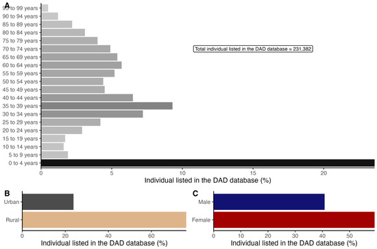 The summary statistics for individuals listed in the DAD database by age category (A), location (B), and sex (C). Urban/rural is defined using the Statistical Area Classification type (SACtype). For this study, SACtype descriptions 1 (census subdivision with census metropolitan area), 2, and 3 are designated as urban and categories 4 to 8 (census subdivision withing territories, outside of census agglomeration) as rural.