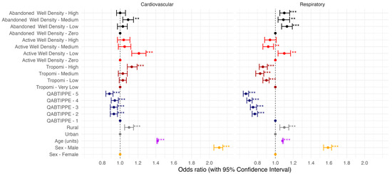 The association between well density (abandoned and active, respectively in black and red), TROPOMI NO2 (in dark red), and cardiovascular- and respiratory-related outcomes in Alberta Canada, adjusted for sex (in orange), age (in purple), location (in grey), and income (in dark blue). QABTIPPE (Neighbourhood Income Quintile Before Tax) was used as a proxy for income. Abandoned and active well densities and TROPOMI NO2 concentrations were classified into four categories (zero/very low to high). * p < 0.5; ** p < 0.01; *** p < 0.001.