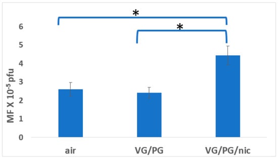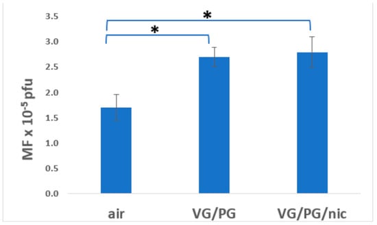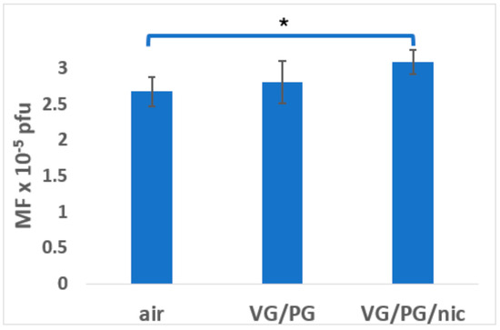 Effect of 3-month whole-body exposure of C57 lacI mice (Big Blue) to e-cig aerosols or filtered air on mutagenesis in bladder urothelial tissue. E-cig aerosol without nicotine (VG/PG); E-cig aerosol with nicotine, (VG/PG/nic), pfu (plaque-forming units). All groups consist of females + males. n = 13 for air, 10 for VG/PG, and 9 for VG/PG/nic groups. *, p < 0.02 vs. filtered air group in one-tailed t-test; error bars, mean ± SEM.