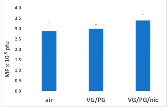Mutagenesis in liver tissue was similar in all three exposure groups. Although the differences failed to reach statistical significance, the level of mutagenesis was highest in the VG/PG/nicotine group (Figure 4, Table 1). Moreover, there were no significant differences in mutagenesis between any of the male and female treatment groups (Table 1).