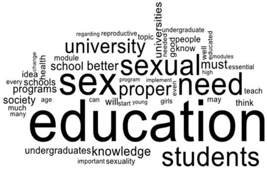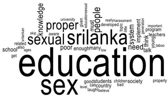 A word cloud has been used to analyze the two open-ended questions. A word cloud is performed to rapidly understand the most frequently appeared terms in a body of text by using a graphical illustration of word frequency and quality [95]. The most frequently appeared terms from Word Cloud represent what the mostly stated respondents’ views regarding sex education in Sri Lanka among UGC-approved non-state undergraduates and ideas about sex education in universities were. Pro Word Cloud in Microsoft Word 2019 has analyzed the open-ended questions mentioned above.