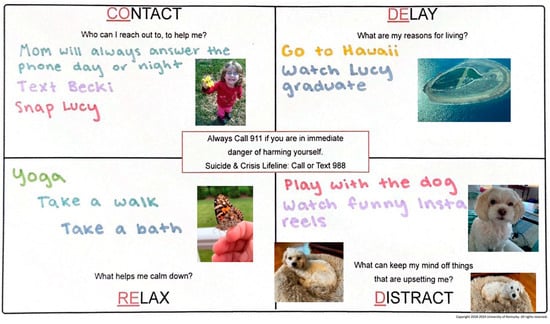 Developed by the first author, CODE RED is a new universal safety planning intervention designed to collaboratively create a plan with individuals before they experience what is referred to as their “worst day”. CODE RED stands for “COntact”, “DElay Decisions”, “RElax”, and “Distract” and encourages individuals to create a safety plan by identifying trusted people to contact, delaying risky decision-making, and finding activities to relax and distract from thoughts of suicide. The program can be delivered to both adolescents and adults in a one-hour interactive group training session. During the training, individuals complete their own safety plans while the group leader provides instructions and shares their personal plan as an example. Completion of CODE RED training results in a physical or electronic plan with all the necessary information for future use (see Figure 1). Individual plans are completely personalized and may include written notes, personal photos, drawings/art, or images from magazines or the internet.