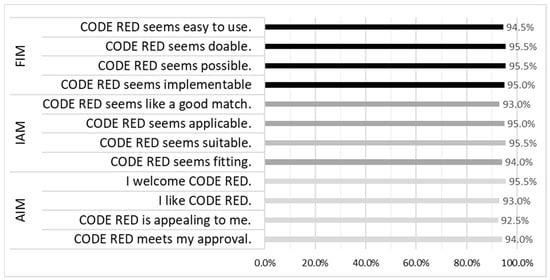 Accessibility, Appropriateness and Feasibility of CODE RED (Note: Acceptability of Intervention Measure (AIM), Intervention Appropriateness Measure (IAM), and Feasibility of Intervention Measure (FIM)). Percent who agree or strongly agree.