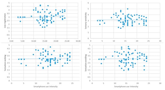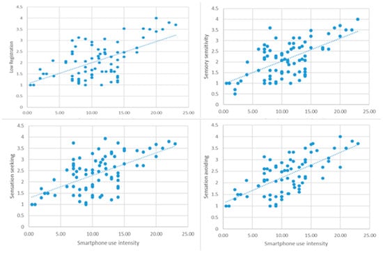 With reference to the correlation between smartphone use intensity and difficulty in managing sensory stimuli, for the typical development group, the results showed a significant positive, as evidenced by the significant correlations between smartphone use and sensory processing across all sensory components: r = 0.370, p < 0.01; r = 0.340, p < 0.01; r = 0.443, p < 0.001; r = 0.325, p < 0.01 (Figure 1). This suggests that greater smartphone use is associated with increased difficulties in sensory processing, indicating that adolescents with typical development may experience sensory overload due to intense device interaction.
