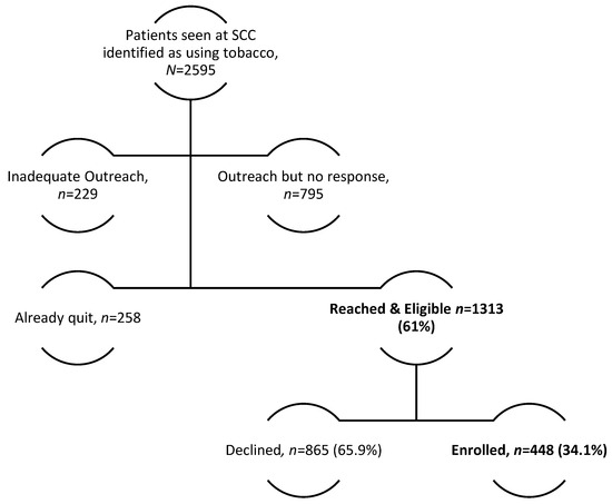 Altogether, the SCC treats approximately 33,000 patients annually. With a universal tobacco screening process in place, all patients seen for care at the SCC who report recent tobacco use are contacted by the Stanford Tobacco Treatment Service (opt-out model). The Stanford Tobacco Treatment Service team treats about 400 patients annually. To date (10 August 2023), since January 2019, the Stanford Tobacco Treatment Service has engaged 1637 SCC patients in treatment (44% engagement rate); tobacco quit rates are 27% at 6 months and 34% at 24 months among those with reported outcomes (if those with missing data are assumed to have returned to using tobacco, quit rates are 19% at 6 months and 25% at 24 months). The Stanford Tobacco Treatment Service’s engagement and efficacy outcomes are “best in class” per the medical literature [25,32].