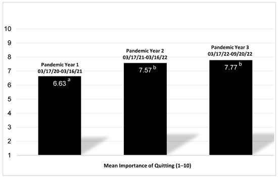 Mean Patient Reported Importance of Quitting by Pandemic Year (n = 693). 1 The letters indicate which means are different from each other. 2 The importance of quitting scale ranges from 1 (lowest) to 10 (highest).