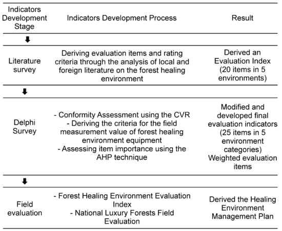 Evaluation indicators, that is, evaluation items and rating criteria, are useful when quantitatively evaluating the environment [26,27]. This study used a three-stage research method. First, a systematic literature survey was conducted by comprehensively collecting and analyzing existing data on the forest therapy environment evaluation items and rating criteria. Evaluation items and rating criteria were organized around the landscape, forest air, sunlight, sound, and anion presented by the Korea Forest Service.