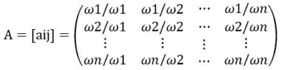 AHP-based importance was assessed for the final evaluation items to calculate the weight of each item. The AHP, developed by Saaty [39], is a technique that determines priorities by stratifying multiple attributes and identifying the importance of each attribute. The AHP derives a consistency index in the process of integrating pairwise comparison results to check the logical consistency of decision-makers. When the consistency index (CI) exceeds 0.1, the decision is reviewed to ensure the logic and rationality of the decision maker. The AHP is applied in various fields, such as policymaking, decision-making, and follow-up project evaluation data (Figure 3) [40,41,42,43]. In Figure 3, “A” is the property of a pairwise comparison matrix, and “aij” is the property of a pairwise comparison matrix “A”. Furthermore, “n” is the number of elements to be compared within a layer, and “ωi” means the relative importance of “n” elements. In this study, if the CI or consistency ratio (CR) of the panel responses was 0.1 or more, the item was excluded from the analysis.