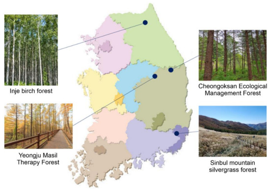 The sites were assessed to validate the final forest-therapy environment evaluation index. As for the evaluation sites, 40 national luxury forests and the top 100 mountains nationwide, which are major forests in Korea designated by the Korea Forest Service, were reviewed. As a result, four national luxury forests located in different climates across Korea (See Figure 4) with clearly designated areas and scopes were selected among places; these are well-preserved forests that have excellent ecological value.