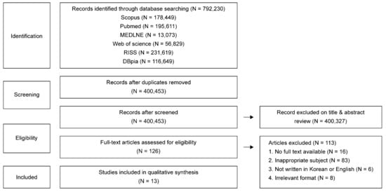 A total of 792,230 studies were found through database searches (Scopus, N = 178,449; Pubmed, N = 195,611; MEDLINE, N = 13,073; Web of Science, N = 56,829; RISS, N = 231,619; and DBpia, N = 116,649). After deduplication, 400,453 remained. Of these, 400,327 did not match the research topic and were excluded based on the criteria for selecting and excluding data focusing on titles and abstracts. A total of 126 papers were selected, and their full texts were confirmed. Consequently, 113 studies were excluded, including those that could not be fully confirmed, those that did not meet the evaluation criteria, those not written in English or Korean, and irrelevant formal documents (Figure 5).