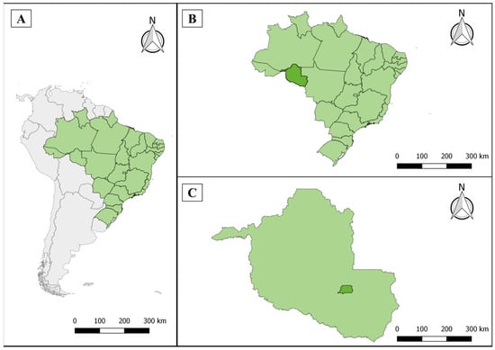 Study area. South America, highlighting Brazil (A). State of Rondônia (B). Municipality of Rolim de Moura (C), located in the Zona da Mata region.