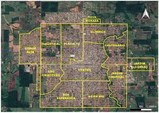 The study focused on 12 distinct sectors within the municipality: Beira Rio, Boa Esperança, Centenário, Centro, Cidade Alta, Industrial, Jardim Eldorado, Jardim Tropical, Nova Morada, Olímpico, Planalto, and São Cristóvão (Figure 2).