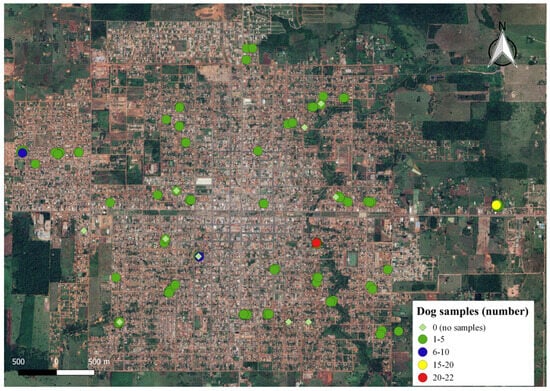 The inclusion criteria for this study was the consent of dog owners, given the absence of official data on the actual canine population size in the municipality. A total of 183 dogs from 61 households within the study area participated (see Figure 3 and Appendix A).