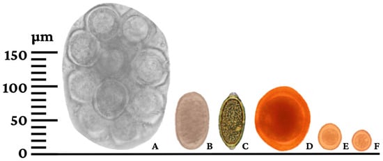 Helminth eggs and protozoan oocysts diagnosed in pet dogs from Rolim de Moura, Rondônia state, Brazil. (A) Dipylidium caninum; (B) Ancylostoma spp.; (C) Trichuris vulpis; (D) Toxocara canis; (E) Cystoisospora canis; (F) Hammondia/Neospora.